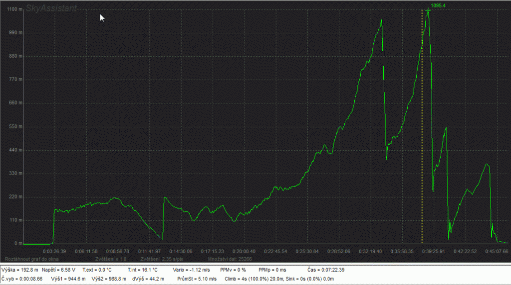 Navíc při včerejším výživném létání ,mi to opět proletělo hlavou. (možná by se to gyro v určité situaci hodilo). Rád létám vysoko a tam není zase takový problém narazit na jádro stoupáku které má 5m/s stoupavost. Včera zrovna --viz graf.