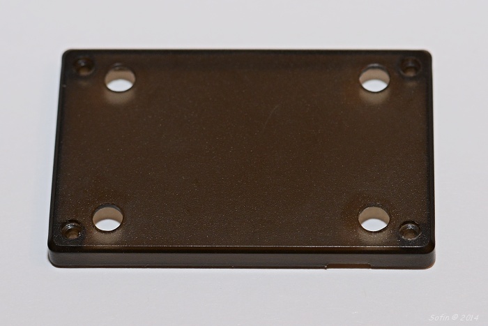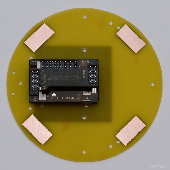 Do krabičky jsem vyvrtal otvory o průměru 5,5mm s roztečí 48x30mm. Do nosné desky koptery jsem vyvrtal otvory s rostečí 52x34mm a oboje to propojil dampery z Hobbykingu. Díky rozdílné rozteči jsou dampery napružené a jednotka na nich docela stabilně drží.