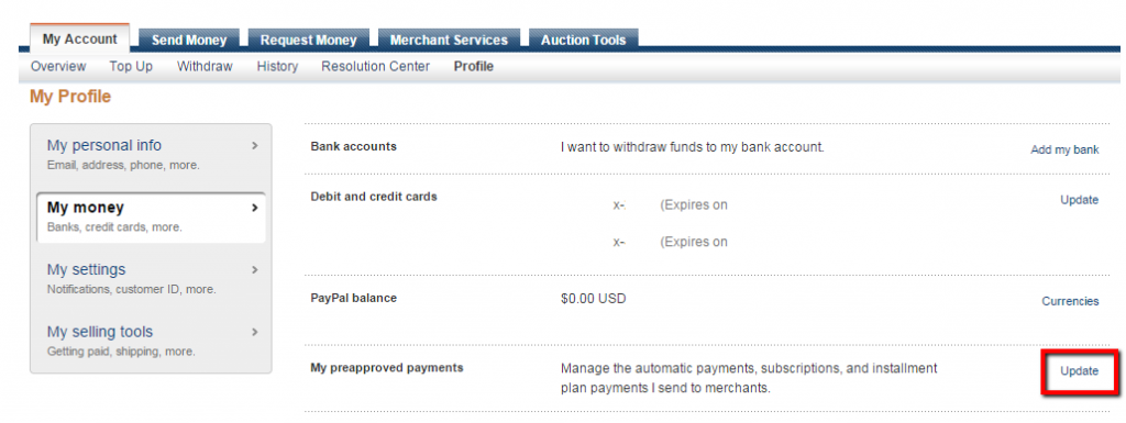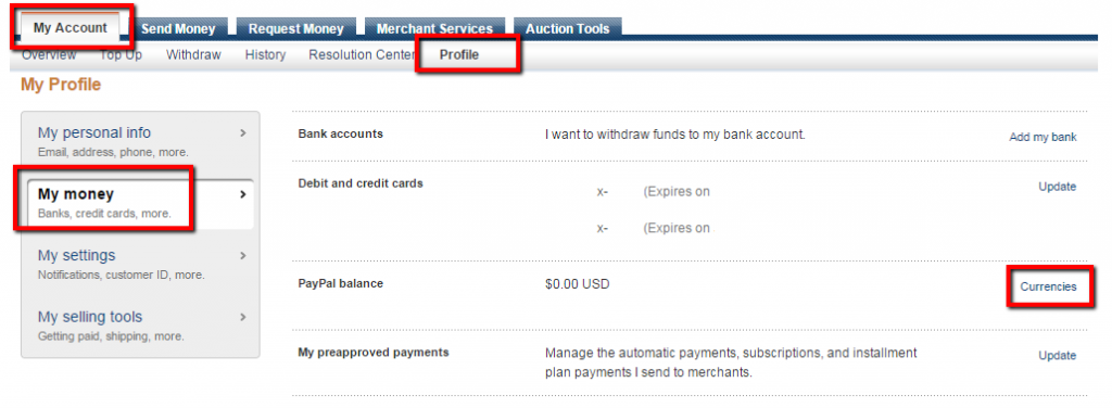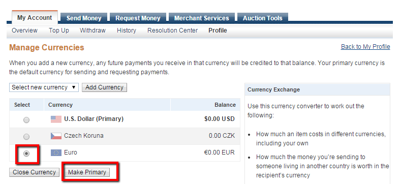 My Account > Profile > My Money > PayPal balance : Currencies > označit měnu : Make Primary