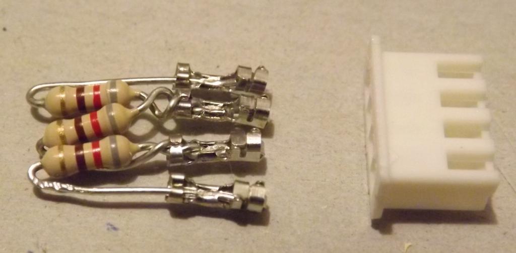 Odpory jsou "co šuplíček dal"; hodnota není kritická, najdu cca 680-1200 Ohm, hlavně všechny stejné, pokud možno z jednoho balení (předpoklad stejné hodnoty odporu).