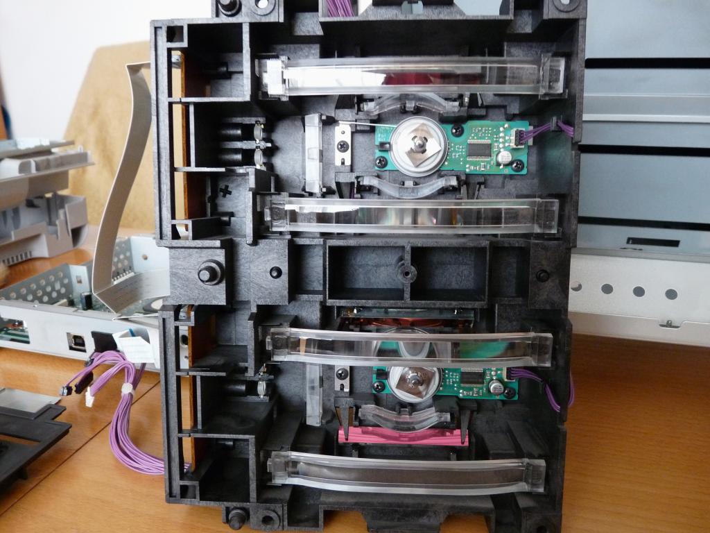 To na první fotce všechno musí ven a pak se teprve dá vmontovat laserová jednotka. Na třetí je trochu vidět to zaprášení zrcadla.