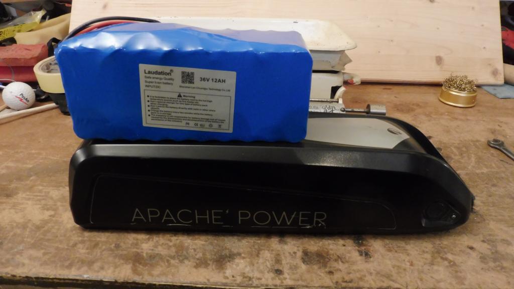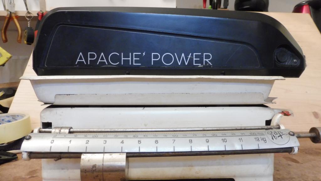 tu Apache baterii , co jsem ted přidělal na ten dětský vozík už moc nepoužívám,tu jsem nechal už jen pro tu jednomotorovku a na tý už skoro vubec nejezdim, jen ji občas někomu pujčuji---ty baterky v těch plastových pouzdrech jsou díky tomu pouzdru hrozně těžký a i veliký, v podstatě místo 13Ah apache se mi vejdou dvě 12Ah čínské baterky jen ve smrštovačce s nárustem váhy o necelý kg----Apache13Ah váží 3k----čínská 12Ah váží 1,8kg, držáky pro ty baterky jsou zhruba stejně těžký, když z té apache odříznu kus velikého masivního hliníkového chladiče---asi v originál verzi je v tom chladiči pak regulátor.