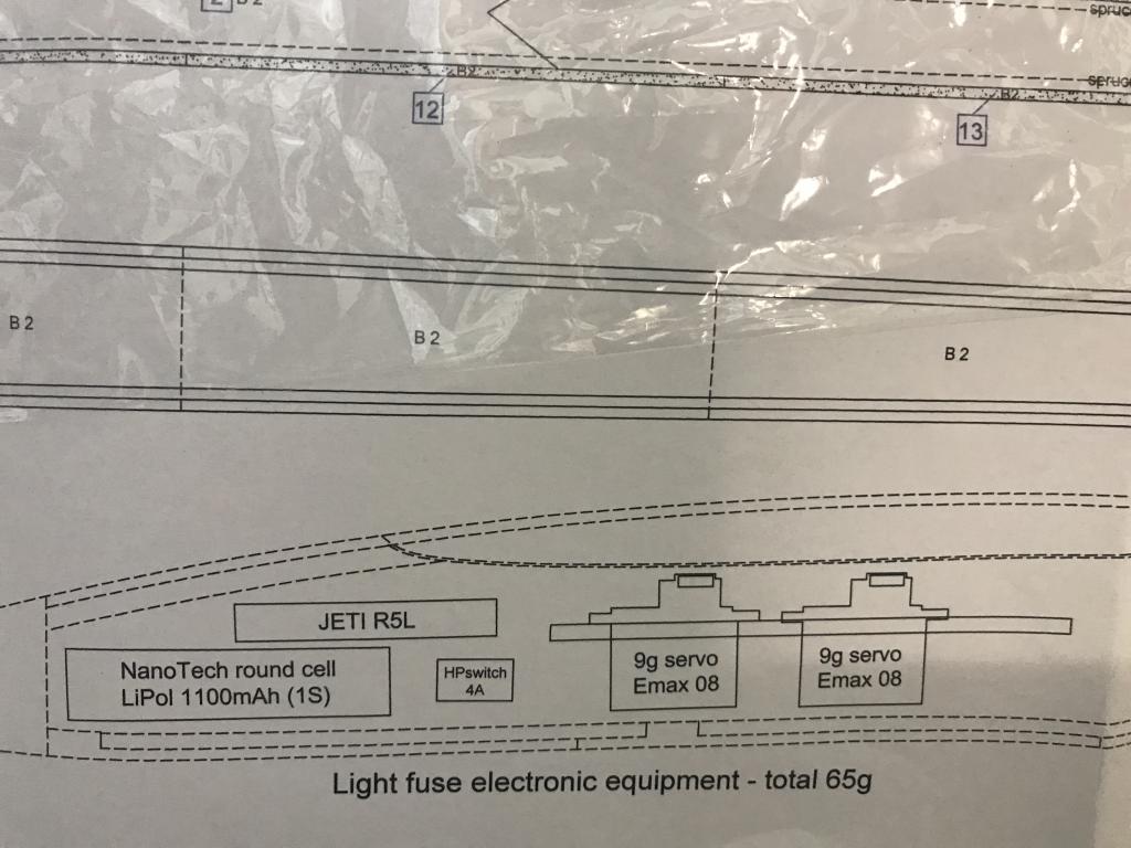 Na plánu je přímo zakreslená kulatá Lipol 1100mAh a pro komplet vybavení kabiny (dvě serva, přijímač, baterka a vypínač) je rozpočet 65g.