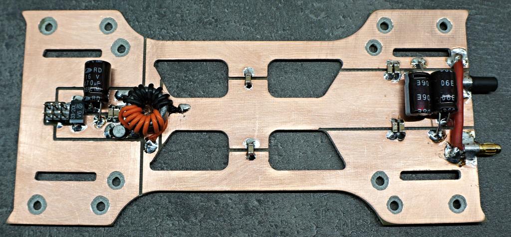 Tak tady je k nahlédnutí první verze spodního plata na regulátory s konektory pro baterku, rozvody, filtry a konektory pro kameru a VTx. Zatím to není leptané, pouze frézované z jednostranného cuprextitu. Chybí napájet pouze regly, měly by dorazit každým dnem.