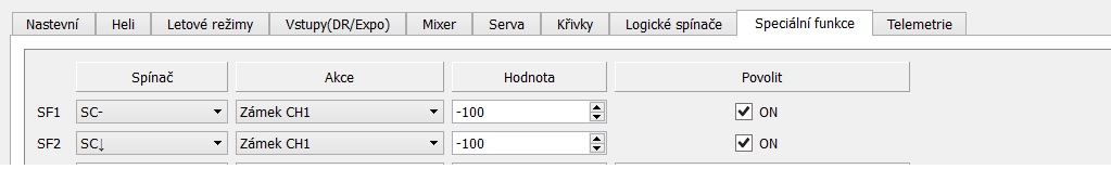 Tipnem si. SC v polohe k sebe použiť ako zámok plynu, na ostatné dve polohy spínača použiť krivky, kde pri SC- by bola, pri polohe knipla plynu dole, hodnota výstupu CH1=-100, pri polohe knipla plynu na maxime, by bola hodnota CH1=0. Pri prepínači SC v hornej polohe (od seba) by to bolo podobne, ale hodnoty by boli -100 a +100.