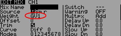 2. V sekci MIXER pak nastavit pro již existující MIX CH1 položku Weight v tom mixu na GV1.