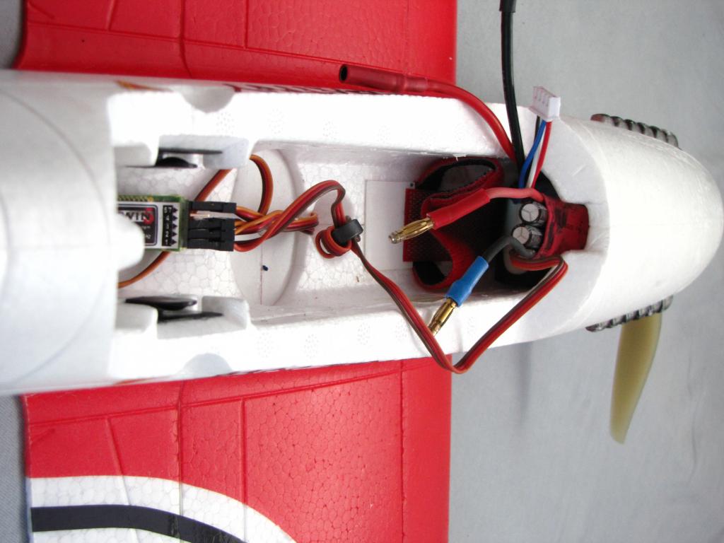 A dáváš tu baterku až za motor? Já jí mám docela dost vepředu, ale vyvážím to :-) Máš řízenou i směrovku? A co máš v trupu za serva?