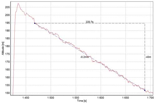Navíc až od 200m beru měření..od té výšky teprve člověk 100% dobře a čitelně řídí model. Navíc nad 200m jsem letěl přez svah asi 500m od letiště, pak tam stačí i slaboučký vítr a je měření zkreslené, neb to vždy míň padá. Takže od 200m létám jen nad naprosto rovným a jednolitým letištěm.