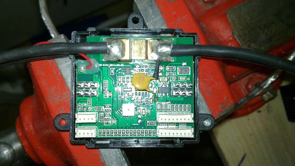 Za motorem je kousek drátů a následuje esc, vedle něj jsem měl baterii a vyšlo to slušně, že nad tím vším jsem měl položený (dostatečně držený silovými dráty) proudový sensor od frsky. Tahle monstrvěc se vedle toho ani nad to nevejde. Dráty to má poměrně silné a špatně ohebné. Navíc dráty jsou (při pohledu na přední část) nad sebou, takže jejich ohýbání je dost problematické a ve směru "nahoru" prakticky nejde. No jak na to koukám, tak nemám nejmenší tušení, jak to tam umístit. Natož, aby to umístění bylo nezprasené a aby mi tam někudy ještě mohl proudit vzduch.