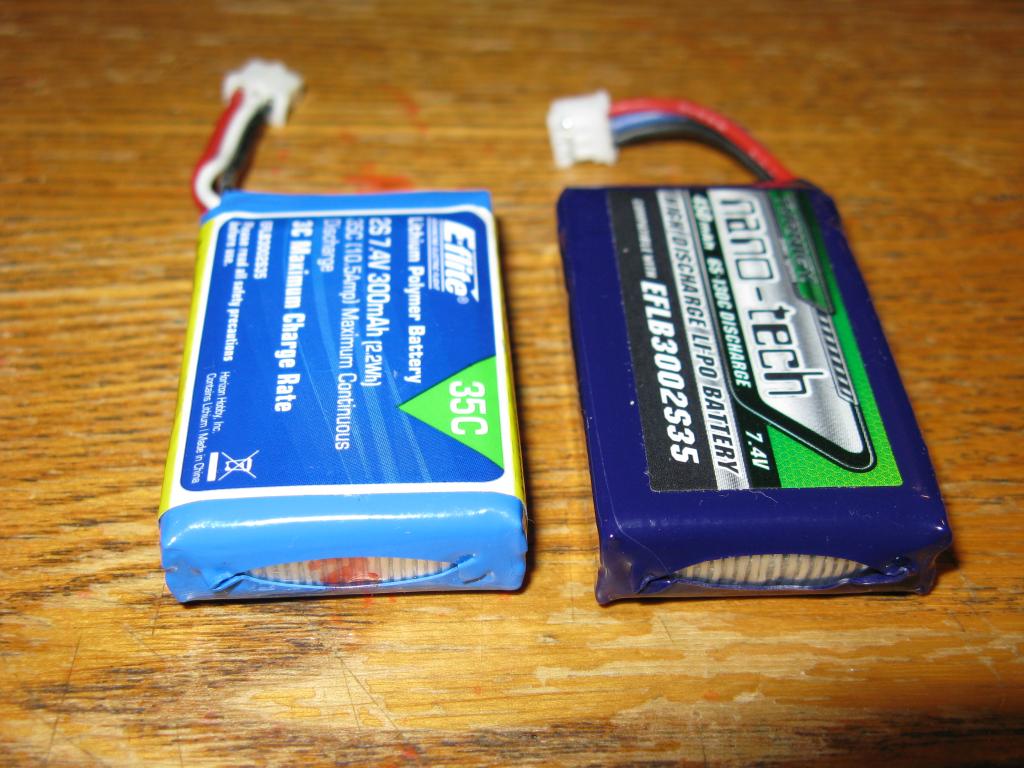 Jsou to 450 mAh s E-flite konektorem - prima nahrada. Dovoli letat cca o minutu dele. Subjektivne davaji i vetsi stavu nez setovky. Jsou pouze o 1,5 gramu tezsi a maji stejne rozmery (+ 1mm delky). Cena neni ani 500, ani 400, ani 300, ale ani 200 Kc za kus, Tome ! Ale pouze 7.36 $ !