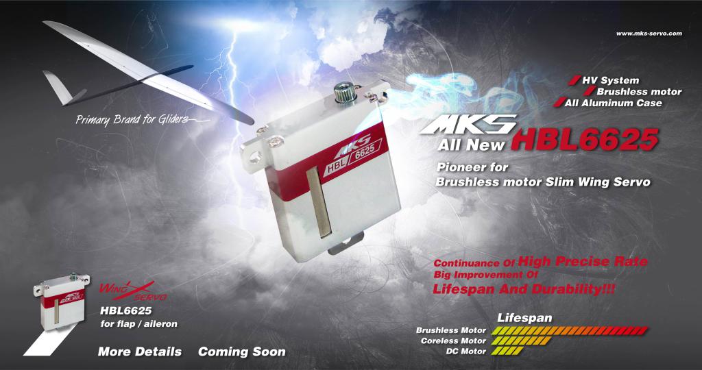 MKS HBL6625 - HV servo se střídavým motorem, chrom-titanovou převodovkou a celokovovou krabičkou určené do křídel pro modely větroňů. Tah 10,4 kg/cm, rychlost 0.11/60st při 8,2V!