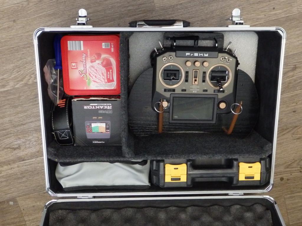 Zdravím, pult jsem si vyřízl z 6mm březové překližky podle vzoru pultu na Spectrum, někde na webu jsou ke stažení vzory pultů na Futabu, Spetrum atd ve formátu crd. Vysílač i s pultem nosím v kufru z HK původně na kvadrokoptéru. Koupil jsem ten největší, mám v něm dneska všechno, vysílač, nabíječ, krabičku s díly - šroubky, měřáky atd., kufřík s nářadím a pouzdro LiPol bateriemi, pod nimi mám náhradní vrtule. Díky tomu nic nezapomínám, na druhou stranu kufr opravdu není nejlehčí