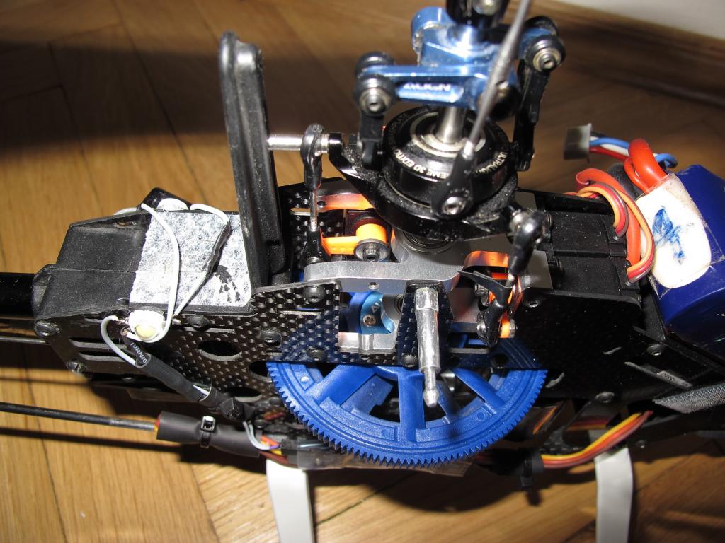 Hlava má kombinaci DFC unašečů kde jsou DFC páky na desku cykliky nahrazeny klasickými táhly s protiběžným závitem do kloubků pro rychlé nastavení listů a letité vylamování šroubkovaných prodloužení s kuličkou na konci je konečně odstraněno. Ničil se závit v unašečích, byla to otrava. Cestou krátké hřídele bez kompenzátoru jsem nešel i když mi to tak jak je to posané bezprostředně tady zdá jako dobré řešení