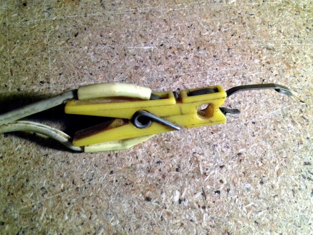 Ale bylo to na radu kteréhosi článku v Modeláři, prý je na to vhodný miniaturní prádlový kolíček pro kemping. Tak jsem si ho sehnal a skutečně byl. A kupodivu, ten jeho plast se ani za 40 let nerozpadl, dodnes drží a nemá žádné praskliny.