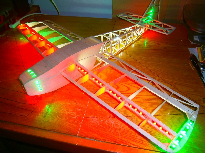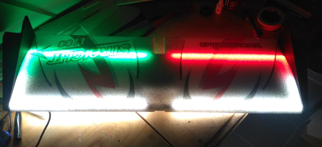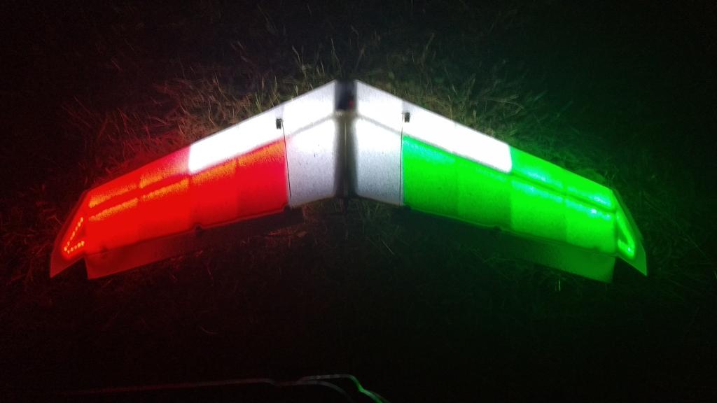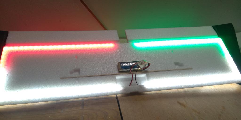 Ano, je to stejně řešené, potah je z 3mm EPP. celkem 3m LED pásků z HobbyKingu, napájeno přímo z pohonné 3S lipol. Viditelnost perfektní, pod letadlem vytvoří krásný osvětlený kruh. Na 1250mAh lipol létá i se svícením s rezervou 15min.