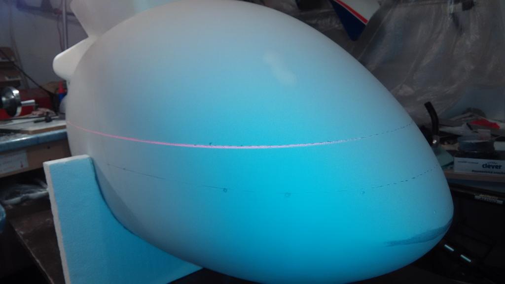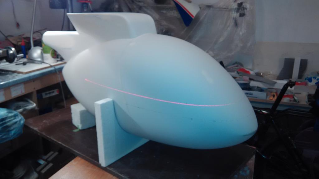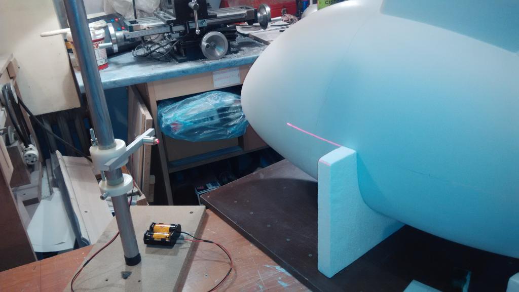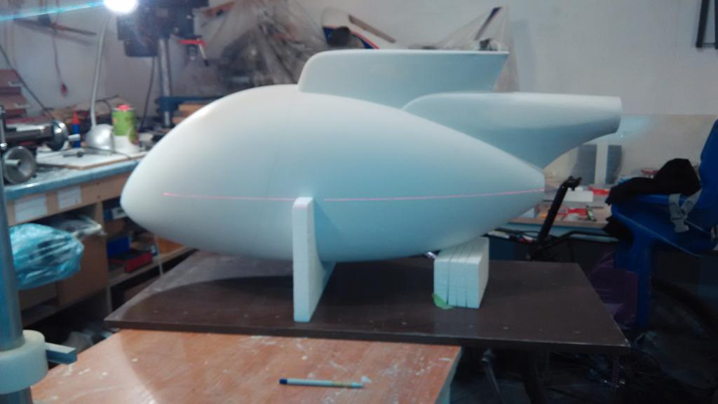 Po opravě heli jsem se konečně zas dostal k práci na trupu, je téměř celý vybroušený a připravený na finální nástřik plničem a pak už jen vyznačit okna, aby bylo vidět, co vyříznout. A vyznačit budoucí díry pro zasunutí podvozkových nohou - prostě aby se na finální skořepině trupu nemuselo pokud možno nic vyměřovat. Dveře budou otevírací. Uvažoval jsem i o otevírací zadní části trupu, tak jak to je v reálu, ale nevím, jestli se mi chce přidělávat si práci. Ale přístup k servu vrtulky by nebyl k zahození Vypadá to, že fígl s laserem pro zakreslení os a jiných čas se na takhle zakřivený trup docela hodí