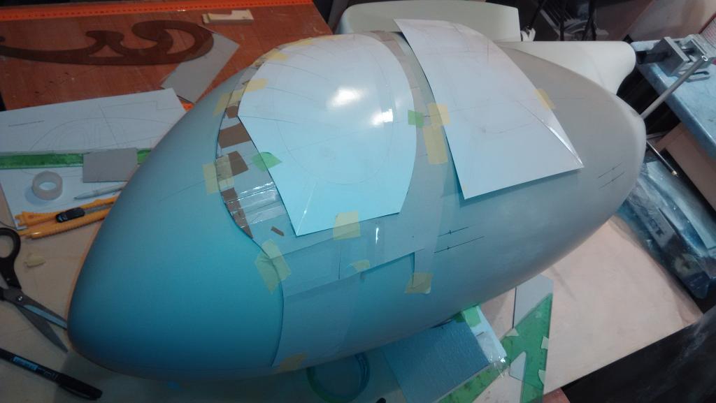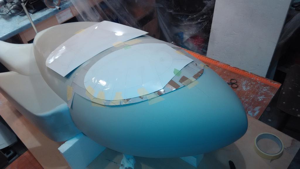Rytí mě čeká teď ale moc ho tam nebude, protože futra dveří budou zapuštěný a to udělám až do hotový formy - doufám, že tak, jak to mám vymyšlený, to bude fungovat Obrysy předního prosklení (sklo bude zasunutý zevnitř do čumáku) nebudu rýt, ale naopak je udělám vystouplý, takže laminát se bude prořezávat uprostřed vystouplý linky a řez se dobrousí tak, aby vystouplá část linky zmizela. Obávám se totiž, že všude není dost tmelu, aby bylo do čeho rýt. Lakýrník mi měl všude nastříkat milimetrovou vrstvu, ale při broušení se ukázalo, že to místy je sotva půl mm a něco jsem z toho ještě odbrousil. Takže doufám, že bude dost na rytí těch pár dvířek a nebo odnímatelných panýlků, co na trupu jsou a na obrys zadního otevíracího krytu turbíny.