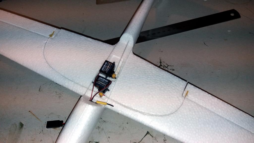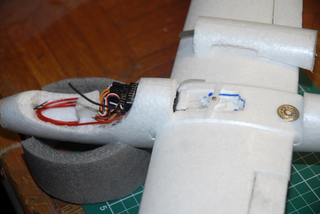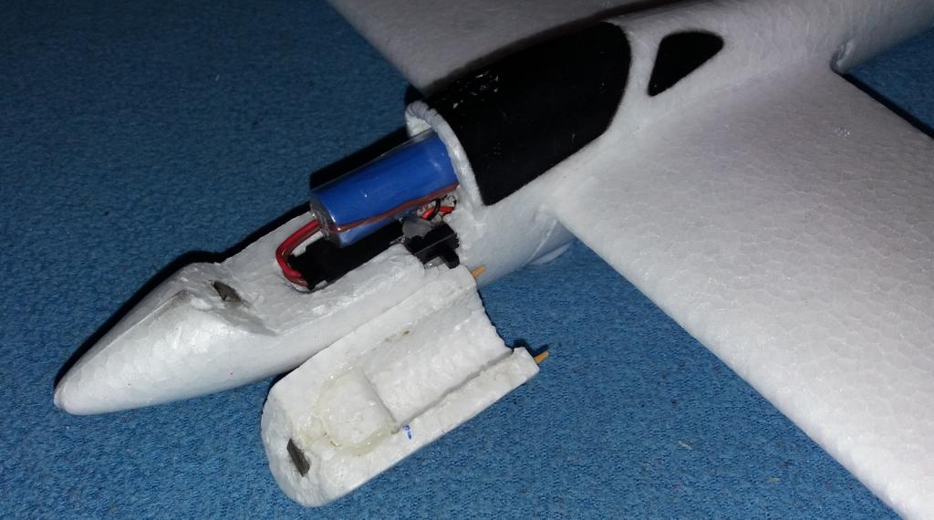 Je to pohled zespoda (ten černý ocásek je to co je vidět z přijímače Gr12-SC); zvrchu je k vidění jen Skytex jako závěs křidélek a výškovky.