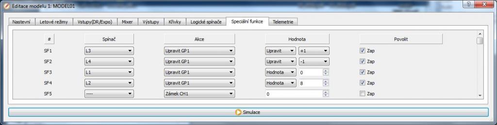 Sekvenčně přepíná LR (letové režimy), celkem 9 (0-8).