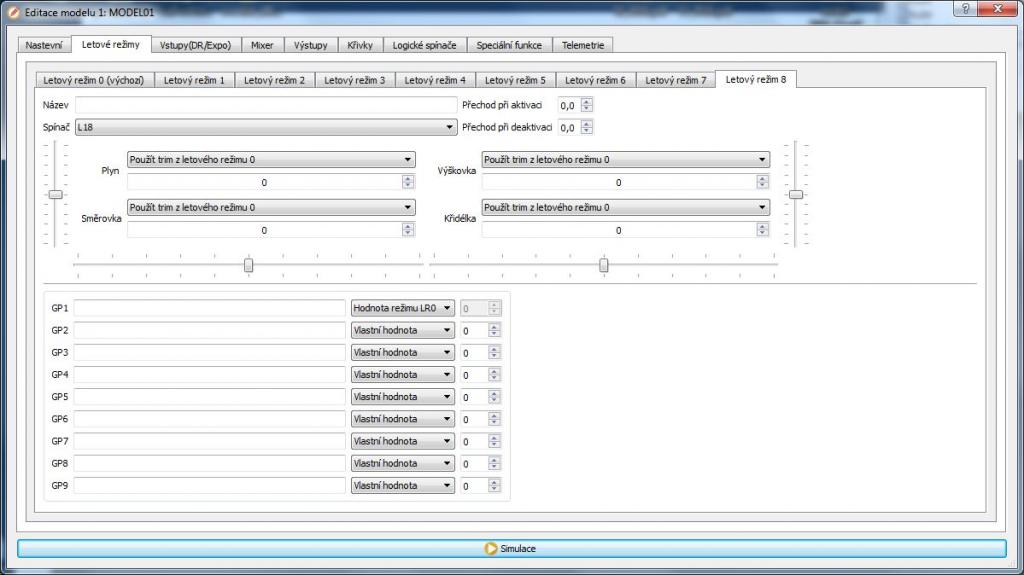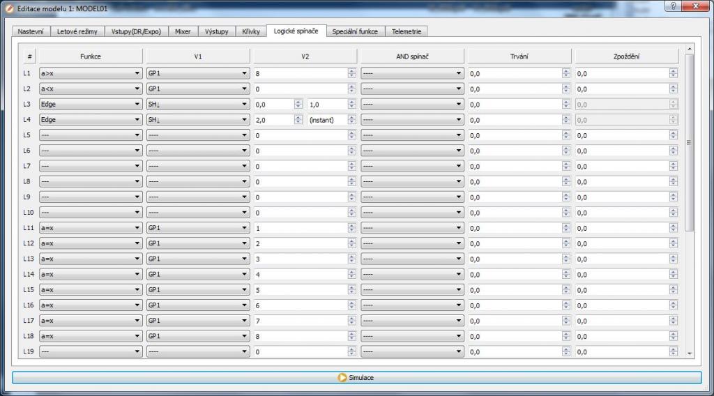 Do mixů pak takto nadefinovaný logický spínač vzít jako zdroj a pokud chci jen od středu do max kladných hodnot (poloh), tak nastavím váhu 50% a offset 50%.