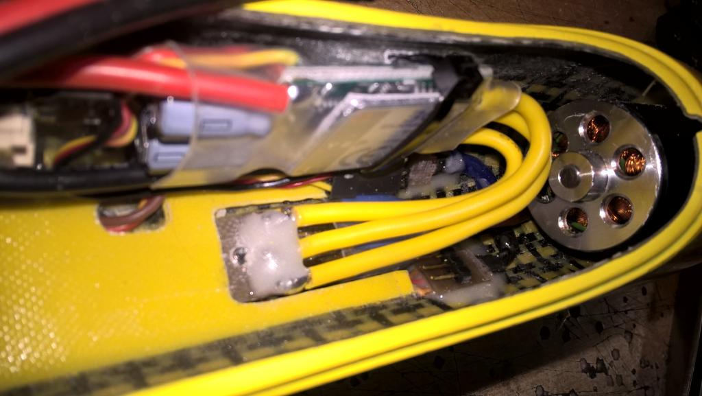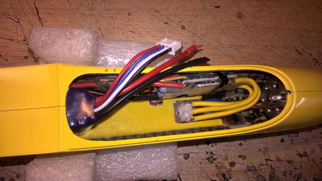 Tezko radit. Prijde mi divne, ze ti vysly ty draty nahoru do kabinky. Ja mam osu motoru sklonenou dolu, takze naopak mam mnohem vice mista na elektrarnu pod motorem a ne nad nim. Diky tomu, mam cast ESC zasunuty pod motorem (co ty tak jako tak udelat nemuzes, pac mas obezku). nicmene zacal bych asi tim, aby draty od motoru vedly spodkem trupu. Pak se da ESC pripajet hodne blizko motoru a baterka se pak pres nej da pohodlne zasunout do motoru. Kdyz jsem jeste v MC pouzival CC 50 (musel jsem zmenit, nebot mi v calculatoru vysle mnohem nizsi prikon, nez pak byla realita a musel jsem dt silnejsi ESC), tak jsem mel kabely z motoru napajene primo do ESC a jeste sejdrem (spatne se to vysvetluje), abych usetril co nejvice mista.