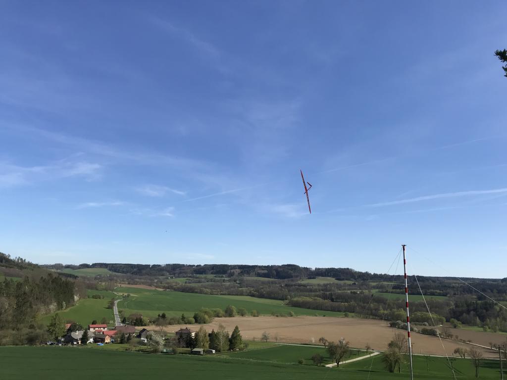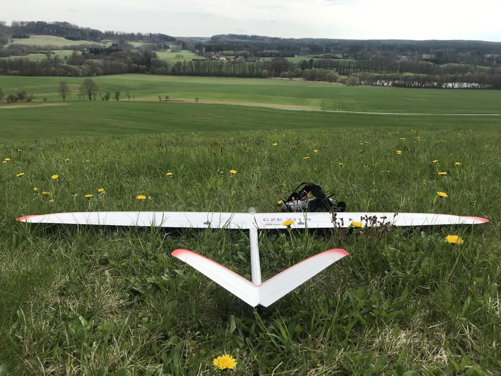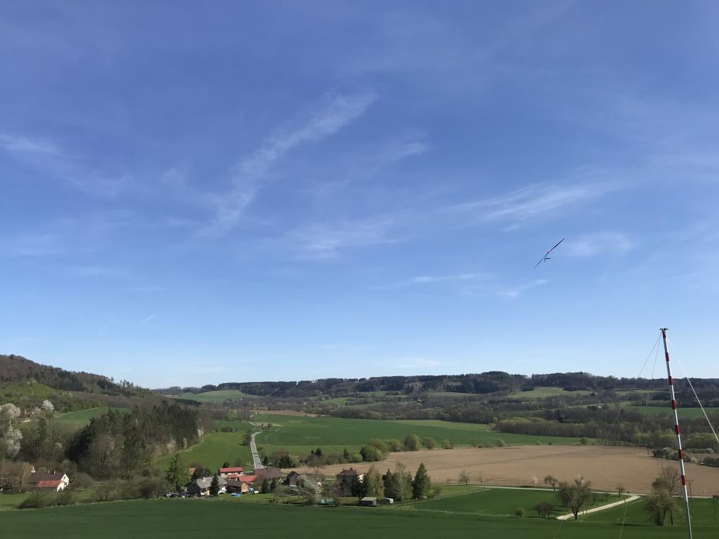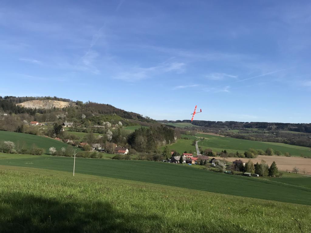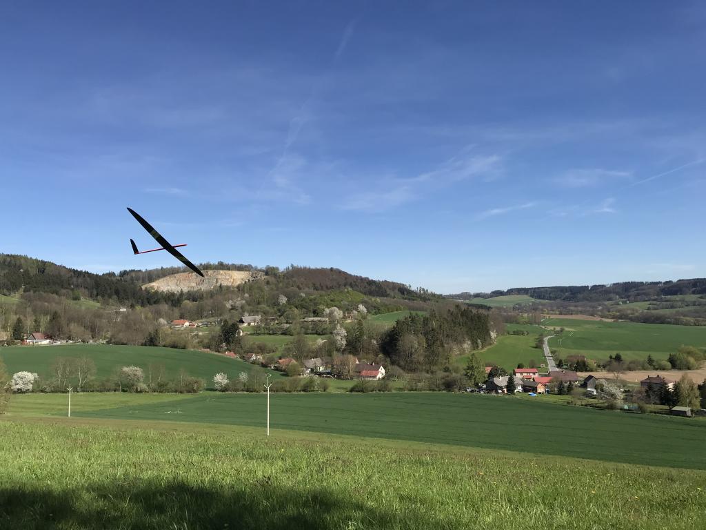 Včera nepřesvědčivá předpověď, přesto jsem vyrazil a dobře udělal, pěkné podmínky na svahu U kostelíčka u Sloupna, vítr 5- 10 m na svah, jen trochu nárazový. Polet s Birdem od R. Munzara a Lady ll Franty Bayera, osvědčená dvojka..nade mnou návštěva svahujících větroňů z letiště Podhořany..Škoda že nedorazil nikdo z okolních letců, z Chotěboře..