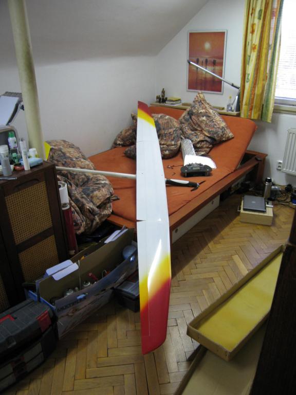 tak dlouhá zima mne dokopala konečně začít dělat i na tomhle letadlu. Model sem koupil od velmi příjemného pána za super cenu na bazaru a rozhod sem se že si ho přez zimu předělám k obrazu svému, teda spíš než stavba je to prostě taková celková generálka, eletroniky pujde uplně znova, i táhla aby se omezily za léta provozu vzniklé vůle a asi i nějaké servo se bude měnit.