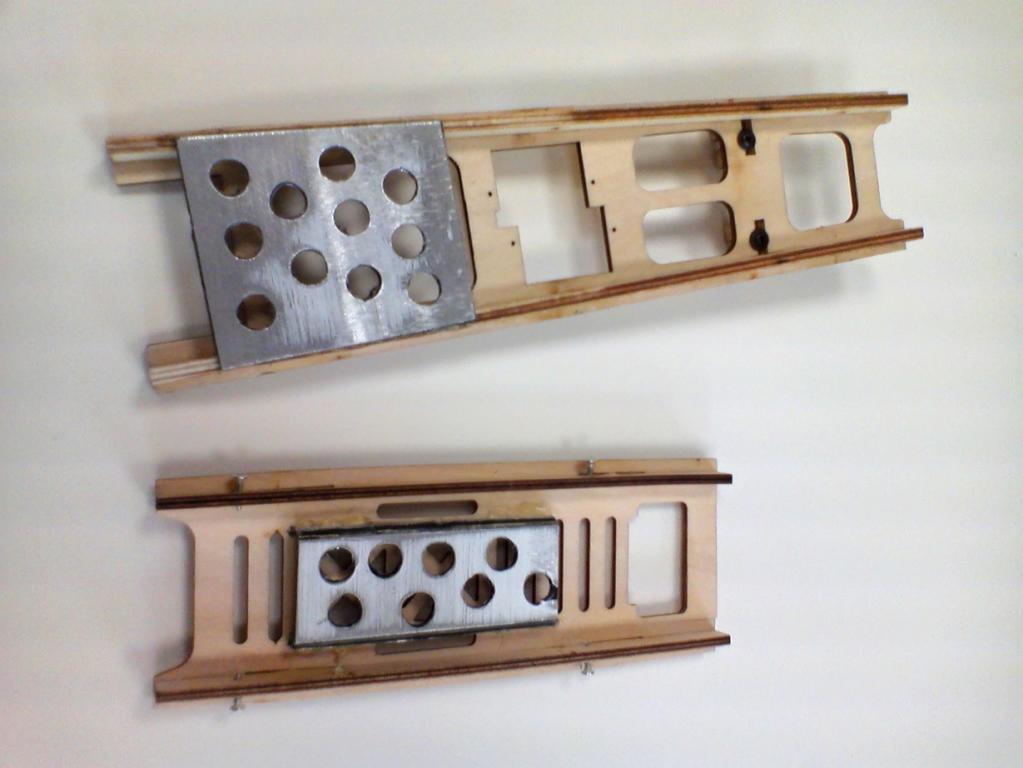 Vyndal jsem překližkové díly z trupu a zespodu na ně namontoval nové díly z odvrtaného 2mm dibondu - kvůli snížení hmotnosti. Díry jsem odvrtal jen narychlo, příště to udělám pečlivěji. Vepředu je destička 2x zahnutá a v ohybech jsou ještě probroušený drážky na protažení sucháče na aku, vzadu jen rovná deska. Nalepeno vteřiňákem a tavným lepidlem. Na tyhle díly pak zespodu přidělam elektrikářskou bindapáskou regulátor dopředu a SBEC dozadu. Vepředu to umožní lepší chlazení regu, kterej je hned pod baterkou - vznikne tam 5mm mezera a vzadu uspoří místo. Samozřejmě by šlo to tam jen nalepit někam na sucháč, ale tohle je lepší řešení a bude se hodit i na příští stavby.