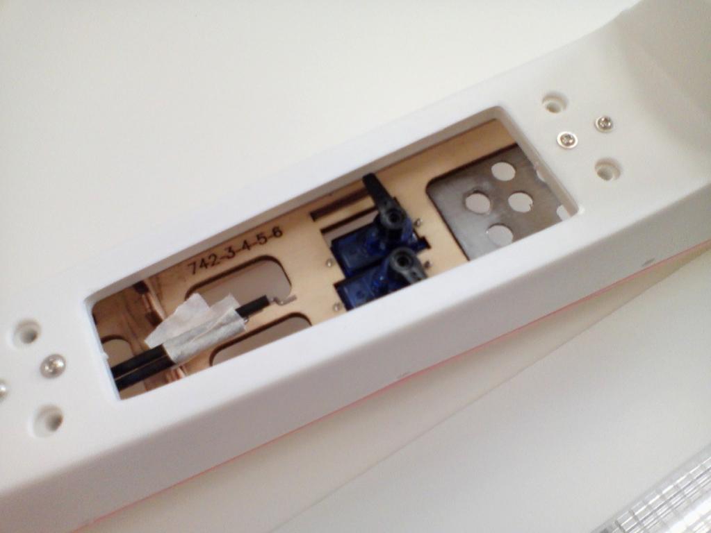 Druhým zjištěním je, že serva pro S a V se musí namontovat zespodu, protože jinak není dost místa na páky pod lemem otvoru. Při zkouškách je vhodné stáhnout lanovody páskou, jde to pak líp zasouvat.
