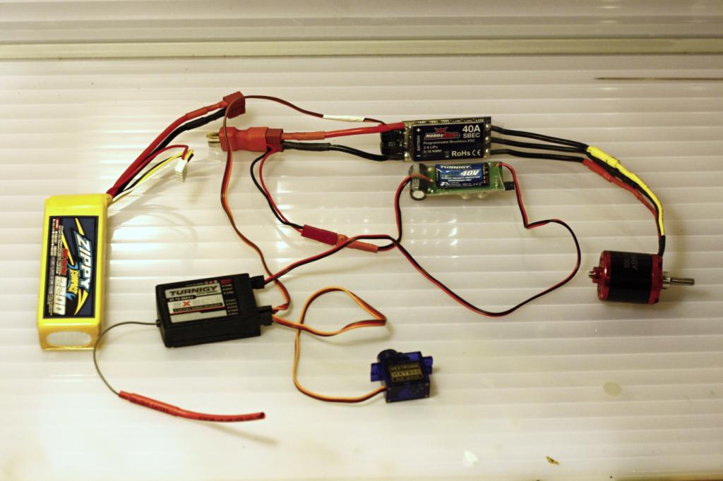 Regulátor a motor je zapojený do přijímače na libovolném kanále, obvykle 3, serva potom do dalších kanálů, každé servo budu mít na jednom kanále, na křidélka a klapky je možné použít V kabel pro křidélka resp. rozdvojku pro klapky, podle toho jestli mají stejné nebo opačné výchylky. Toto řešení se mi však neosvědčilo, protože nejdou nastavovat diferenciace a subtrimy pro každé servo zvlášť, proto je ideální mít každé servo na vlastním kanálu.