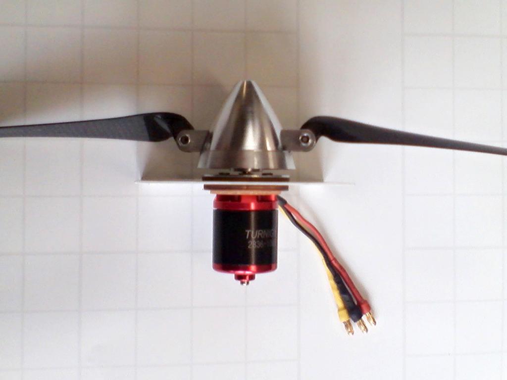 Zkusil jsem, jak namontovat motor - vzhledem k prostoru v trupu to půjde dost blbě, tak jsem to zkusil nejdřív venku - otvory na ložích byly všechny s roztečí 16 mm, proto je třeba 2 propilovat na 19. Pořadí vrstev od kužele je - kovová - tenká překližka - trup (znázorněný 1mm deskou), překližková tlustší (je třeba vyvrtat díry) a cuprexitová kvůli tepelné izolaci. Nejdřív to naostro osadím bez úprav a lepení, při zátěži zkusim, co to dělá, a kdyby se to nějak přehřívalo tak to začnu řešit.