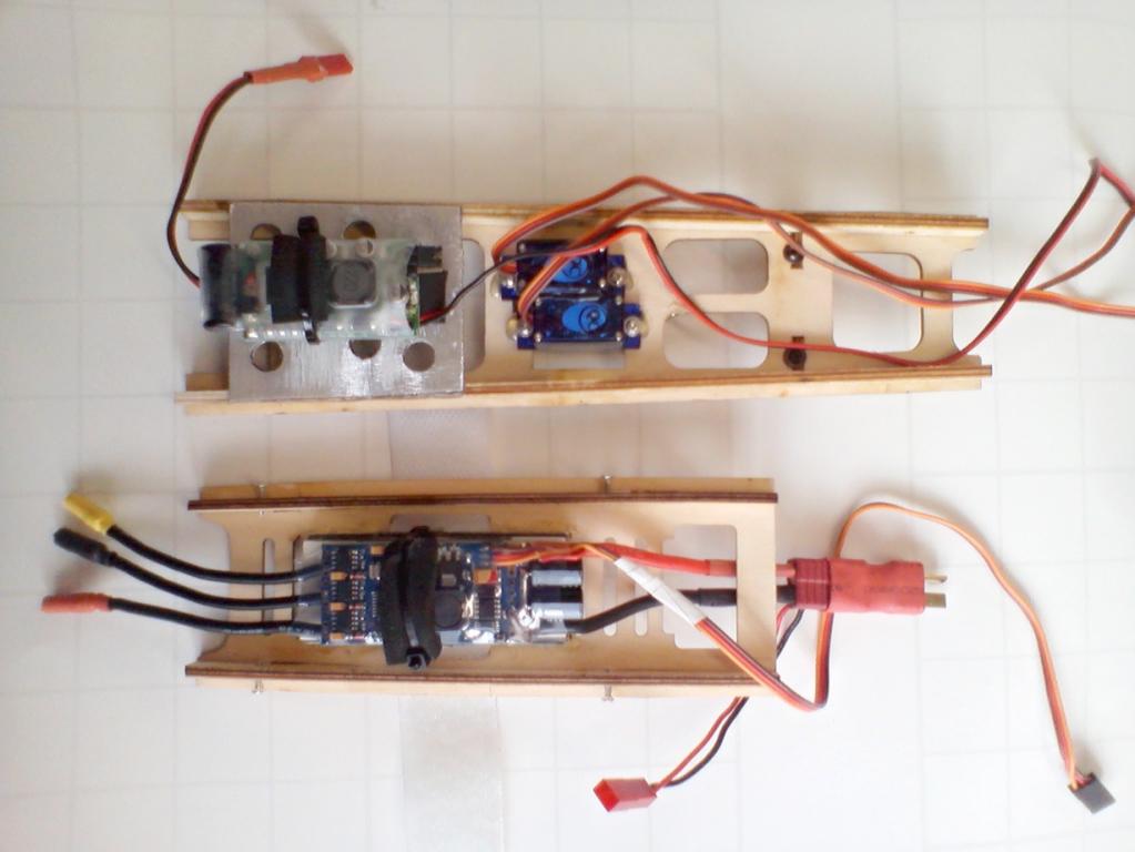 Jak jsem psal výše - namontoval jsem tam dibondové destičky, na které je to přidělané bindapáskou. Pod SBEC - (vystupuje tam kondenzátor, tak se to páskou srovná - je cca 3mm tlustá) a na obě součástky jsem ještě nalepil 3M jednostraně lepící pěnovou pásku, pevně se to pak stáhne, ale nepoškodí se součástky.