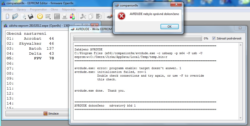 Potřebuju poradit. Najednou mi dnes nejde ani zaboha se propojit s T9x. Mám Windows 7 64bit ultimate. Ovladače pro USBasp mám aktuální, companion9x také. Stáhl jsem si i poslední avrdude (verze 5.5) a zkoušel jsem ho obměnit s tím co instaluje companion9x. Chyby jsou tyto: