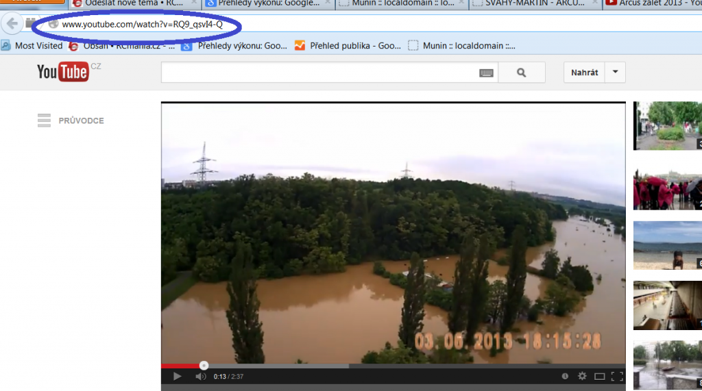 Stejně jako na RCMANII má každá vlákno svůj kód, tak i každé video na http://www.youtube.com/ má svůj kód. Například kód videa RQ9_qsvI4-Q je moje video, jak poletuji s coptérou při záplavách. Tento kód naleznete v adresní řádce prohlížeče u videa, které chcete vložit. Je to obsah parametru v.