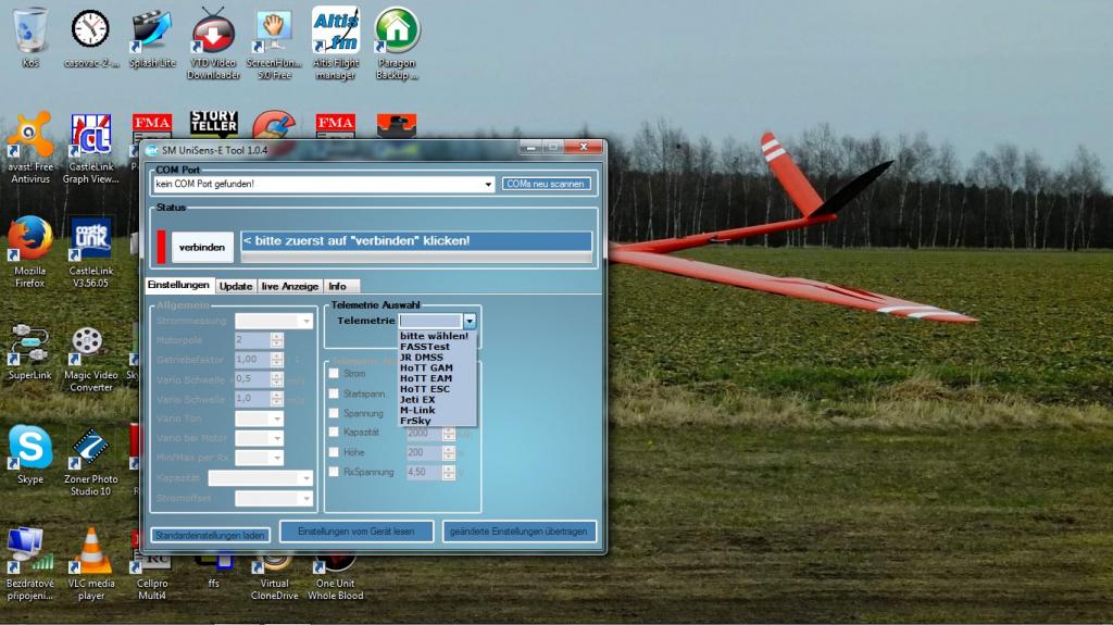 Dalibore, jsem rád, že se opět objevilo toto zajímavé technické téma :) . Nyní k čidlu Unisens-E, které mám v perfektně připraveném Scarym od Dalibora. Nastavovací PC software je skutečně jen v němčíně, avšak obecně k některým produktům této firmy existují anglické překlady - http://www.f5b.co.uk/unilog-in-english.html. Čidlo bylo nastaveno na HOTT-EAM, při prvním zapnutí okamžitě vše fungovalo (napětí, odběry, kapacita, výška,....), kromě zvuku varia. Tuto situaci jsem řešil "zakliknutím" políčka v nastavovacím software, o víkendu vyzkouším zda to bude ok.