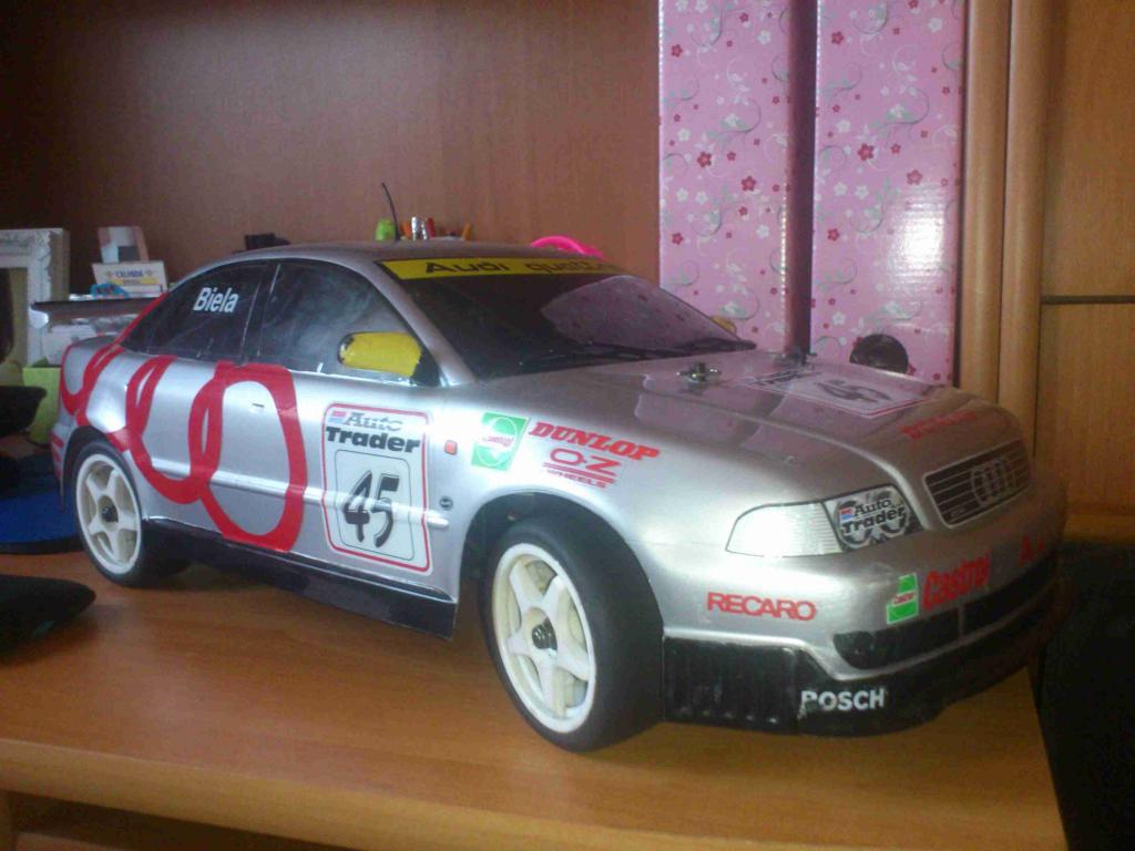 Dostala se mi do ruky tahle Audi A4 jsem spíše přes lodě ale řekl jsem si, když už je to doma tak to oživím a při zkoušce jsem zjistil, že hází levé přední kolo tak jsem to rozebral a zjistil, že je prasklý náboj nebo držák kola kdo jak chce, ať tomu říká, ale nikde ten to díl nemůžu najít. Na podvozku jsem žádný název nenašel akorát na motoru LE MANS Stock 05 a krytu ozubených kol je KYOSHO Corporation.