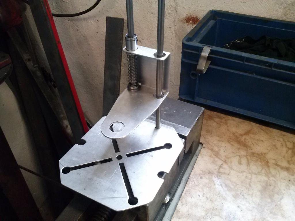 Přijdou na to ještě 2 stavěcí kroužky (ze svěrných spojek na NC mašinky, umístěné budou mezi spodní pouzdro a pružinu), ty budou držák jistit v dané výšce, pod spodními pouzdry budou další jako stavitelné dorazy. Držák je zatím z 2mm plechu, finální kus bude ze 3mm. Zbývá vymyslet pákové ovládání a stolek - ten mám už trochu v hlavě.