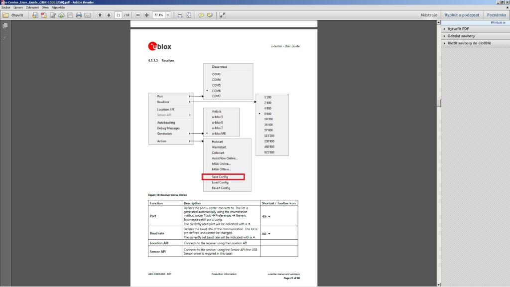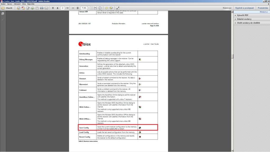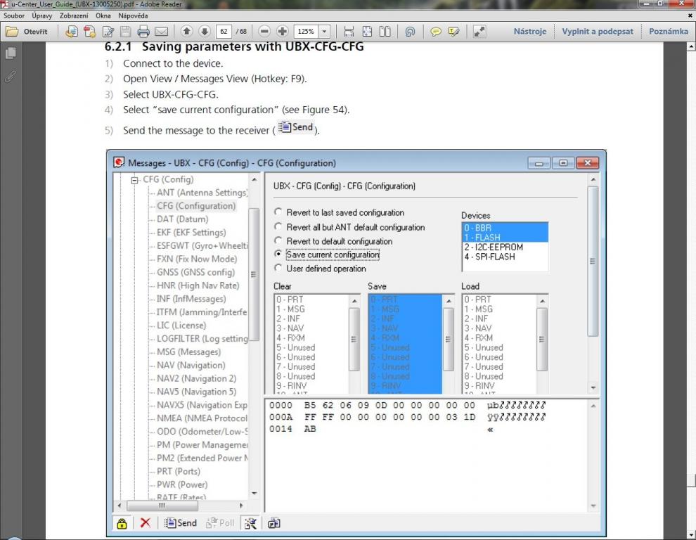 Já mám jenom poznámku k tomu ublox.pdf. Receiver save config neuloží config do modulu ale na disk PC. Do flash se uloží v menu CFG, pokud ovšem modul skutečně má flash paměť. Většina běžných modulů žádnou nemá (NEO6) a tam se to uloží jen do baterkou zálohované RAM.