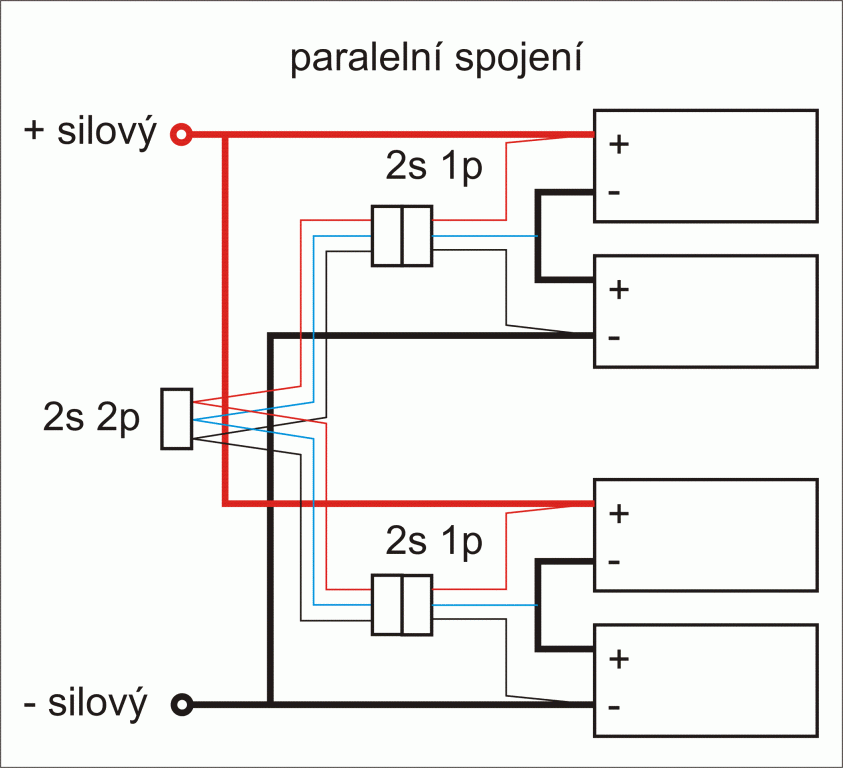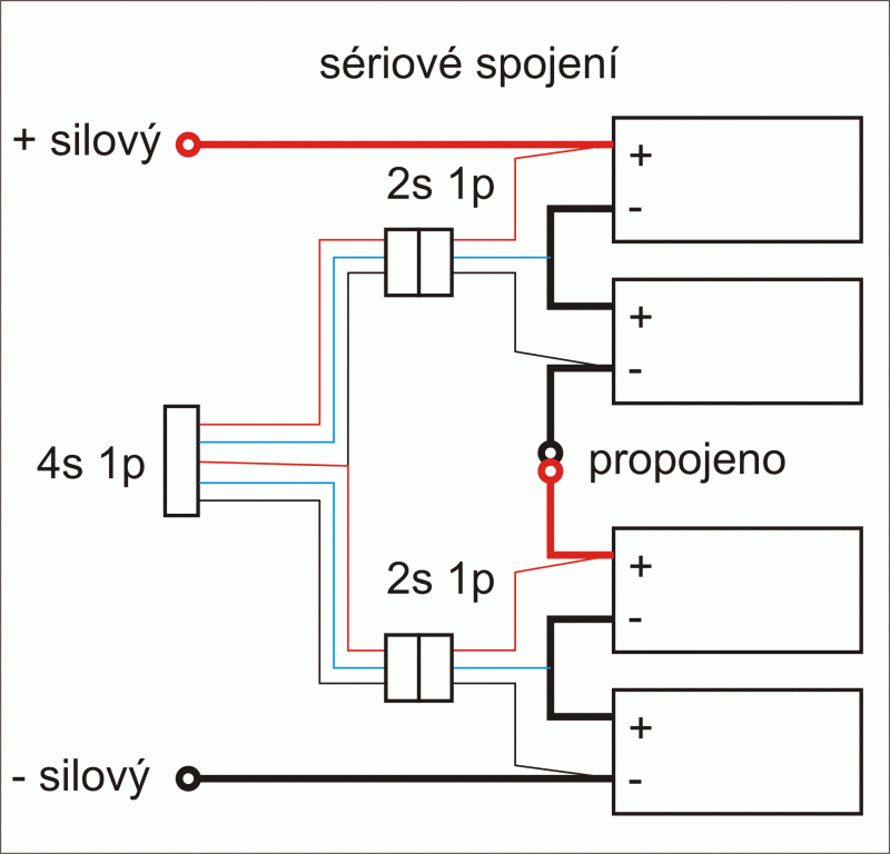 http://www.hobbyking.com/hobbyking/stor ... _Lead.htmla silovou část jsem si udělal sám.Používám to jak na 3S,tak i 2x 2S-pak jsem musel upravit balančák na verzi 2S.Vidím napětí jednotlivých článků obou Lipolek a pokud jsou podobně vybité,tak se to v poho srovná.Pokud více,tak nabíječka při nabití jedné z nich omezí nabíjení,podle velikosti napětí vyřadím tu již nabitou a mohu vložit další a pokračovat.Samozřejmě se snažím dát k sobě podobně vybité. Prostě využívám možnosti nabíjet 6S a při tom zkrátit dobu nabíjení vícera baterií při velikosti nab.proudu 1C.Využívám velikosti baterií 3S 1000, 3S 1800 a 2S 5300.