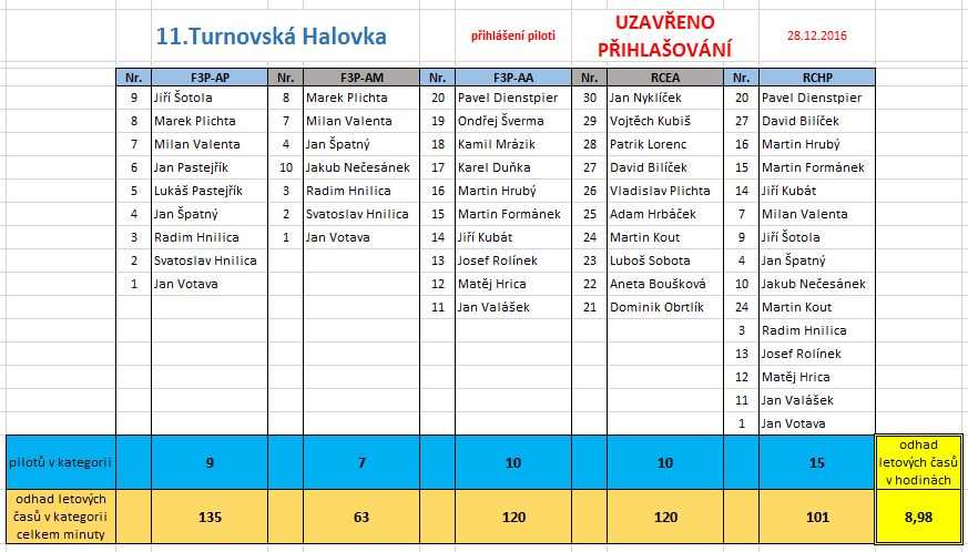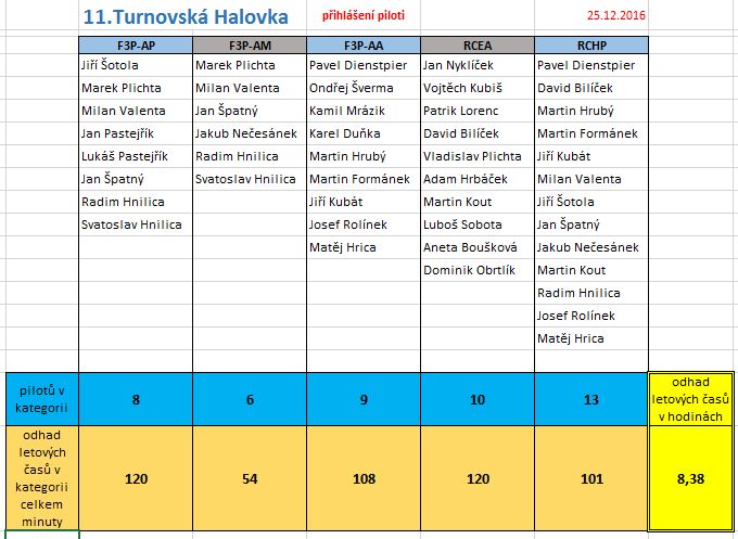 Ahoj všem přihlášeným pilotům, přeji hezké Vánoce a přikládám seznam přihlášených pilotů na 11.turnovskou halovku. Vychází mi asi 8,5 hodiny letových časů bez AirRace. Pokud tento chceme letět, nezbývá než začít soutěžně létat už v 8:00. Halu necháme asi otevřít dříve, o tom budeme ještě informovat. Trimovací čas bych dal od 7:00 do 8:00.