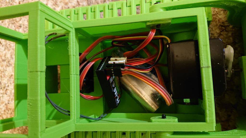 Ovládání je FlySky i6, protože je to malý vysílač do dětské ruky. Serva jsou v kanálu 1 a 3. Nahozeny dva mixy 1->3 100% a 3->1 100%. Fungu je to. Uvnitř to budu muset ještě trochu učesat a doplnit vypínač. Jezdím na dvě lionky napřímo. Serva i přijímač to zatím zvládají, i když je to za jejich limitem.