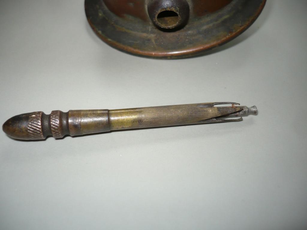 Podle té tyčky mě napadá nějaký doutnák pro startování starých dieslů (traktory, stabiláky...). Podle toho konce té tyčky tam mohl být uskřípnutý nějaký knot, a to těleso byla nádržka na benzín.