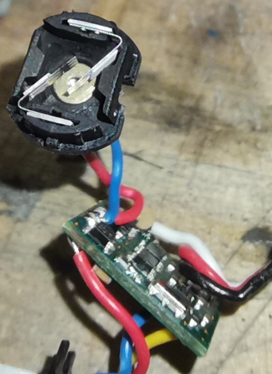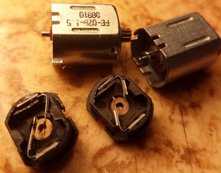 Po rozmontování jsem zjistil, že v tom odešlým za letu má motor nulovej odpor a na dvou tranzistorech můstku servozesilovače jsou "čepice" jak bouchly. Ten motor mě překvapil a tak jsem mu sundal deklík s kartáčky. No a celkem veliký překvápko.