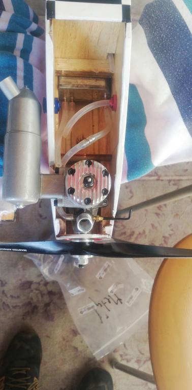 1, - dostavěl jsem u-akrobata Legasy od Brodaka, motor Brodak 40 uložen hlavou dolů, nádrž cca 80 kubíku. Po nastartování motor běží cca 3 -3,5 minuty a zhasne. V nádrži zůstává cca 30 kubíku paliva. Jehla je otevřena na 4 otočky. Nádrž je uložena dle fota ( z trubičky z prava : - do motoru, tankovací, odvzdušňovací.