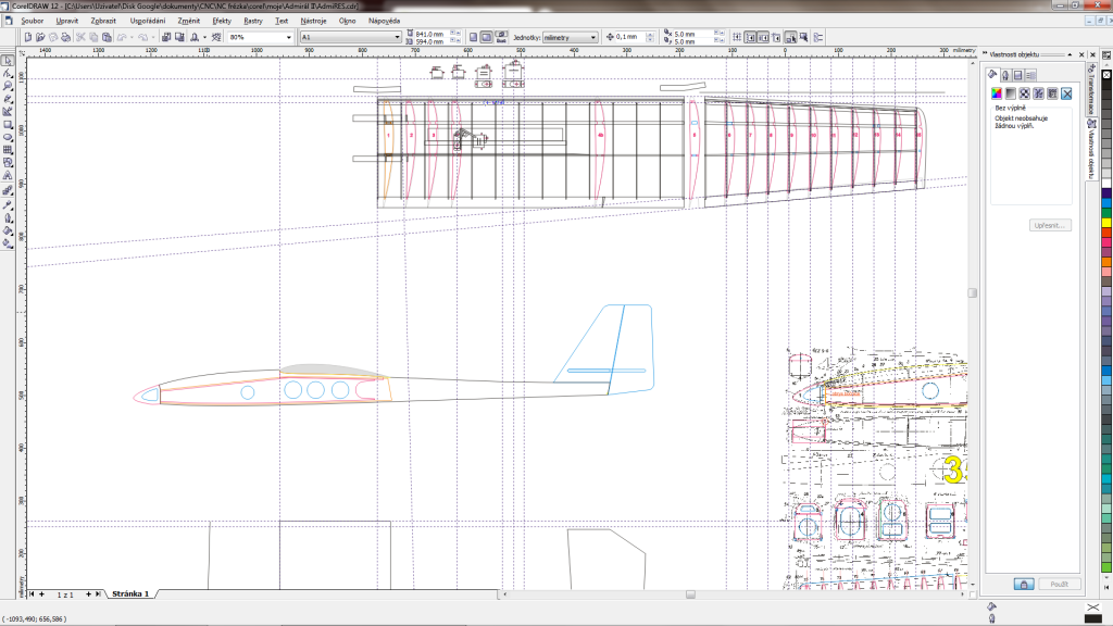 Já těch rozsypů na Admirála II už vyfrézoval... no... ani nevím kolik, ale odhad kolem padesátky to bude. Možná i víc. A ještě jsem ho létat neviděl (v současné době :-) ), ani jsem si ho nezačal stavět. I když se mi pořád líbí (asi ta potlačená nostalgie) :-) Takže pokud vytrvám, stvořím si jeho zmenšeninu a jak Tomáš správně připomněl, se vším všudy, tedy i s tím lomením středu a Téčkem; navíc vlastně budou jen ty spoilery, spíš na zkoušku co to umí, než abych je tam tak moc chtěl/potřeboval - nemám ambice na kdovíjaké soutěžení, ale co když to přece jen trochu slušně poletí :-D
