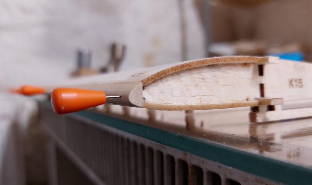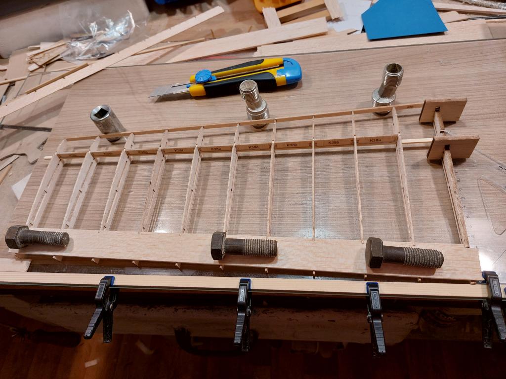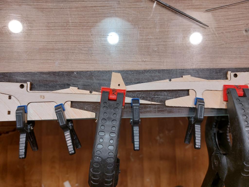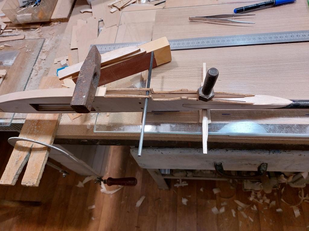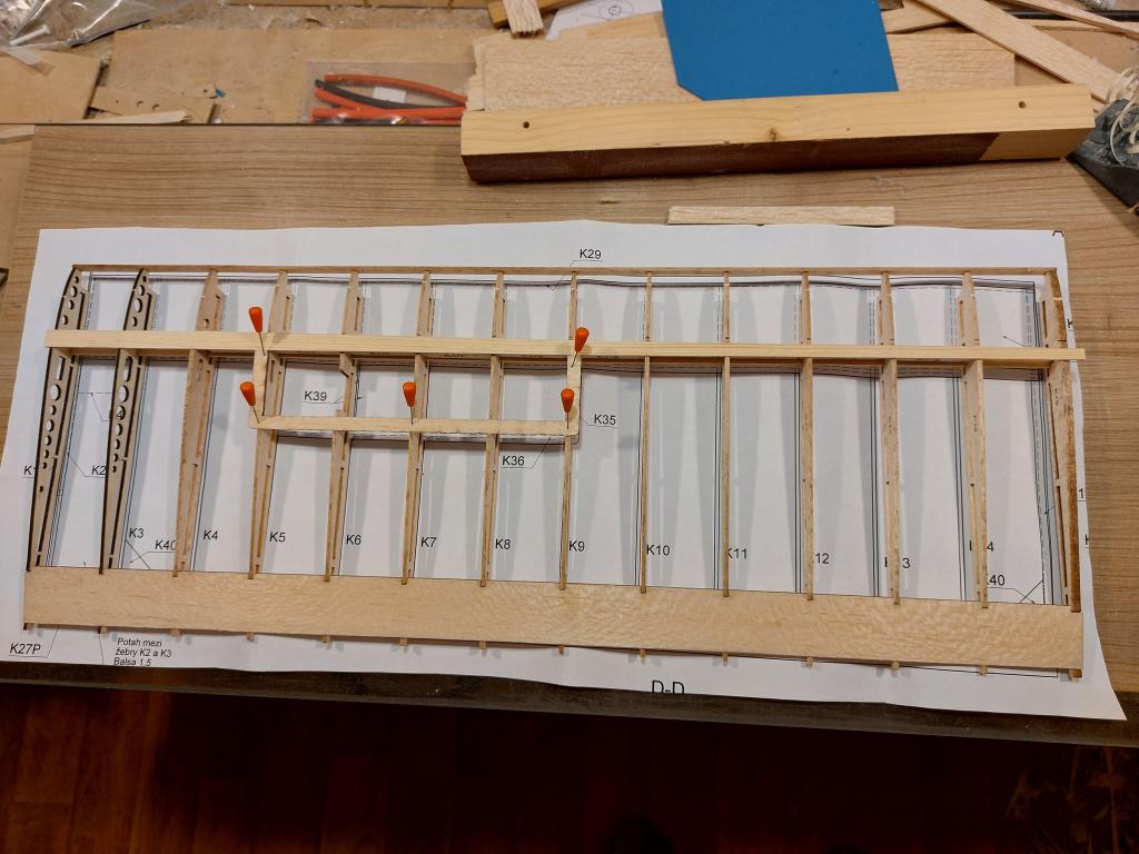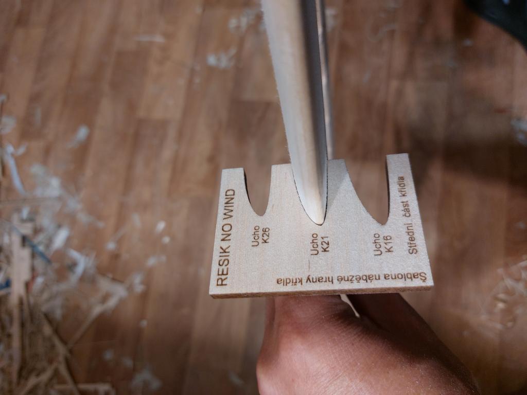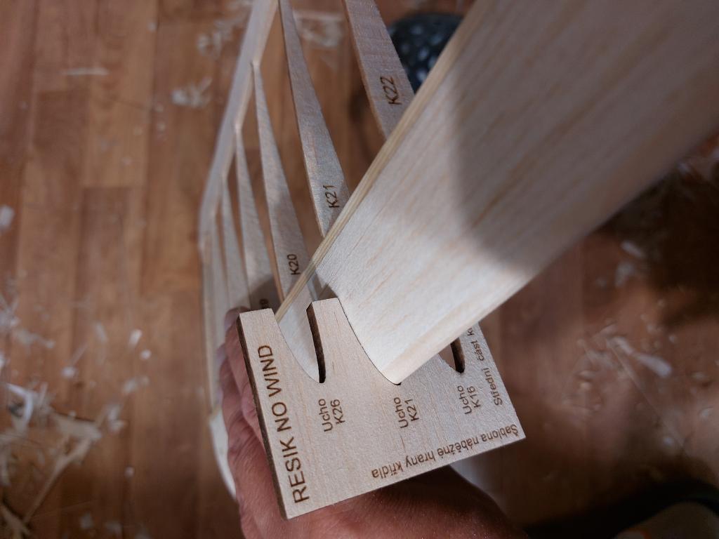 Profil křídla je docela tenký, proto žebra před broušením kostry před potažením, z boku potírám řidkým vteřiňákem. Skoro nic to neváží, ale výrazně to žebra zpevní