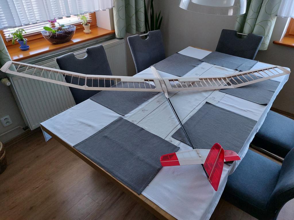 Model se kterým létám váží 440 gramů. Není to sice nejlehčí ale k dané ploše to funguje. Křídla jsou stejně dimenzovaná jako RESIK, což zajistí velmi malý průhyb křídla a i v klidu jde model na gumě vytáhnout vysoko. Potah křídel je z vliesu. Letové vlastnosti a výkonost jsou v klidu s vliesem rozhodně lepší (odzkoušeno!). Další výhoda je menší pnutí potahu a nehrozí zkroucení křídla tak jako u fólie. Profil je v zadní části dost tenký, takže na zkroucení je křídlo dost náchylné.