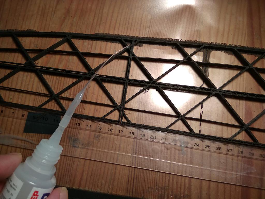 Tak a teď k tý jednoduchosti stavby: konstrukce křídla se lepí na plocho ze 4dílů. Poté se přilepí horní a dolní pásnice nosníku. A hlavní ftip je v tom že Graupner deska se laminuje a lisuje na plocho teprve poté se přilepí ke konstrukci. Potištěnou a olaminovanou desku bych ke stavebnici či ke STL fajlům dodal. Protože se to prodává v balících po 38 kusech a potřebuješ 2, to samé skelná tkanina a epoxid by při nákupu pro jeden model vyšel na nesmysl.