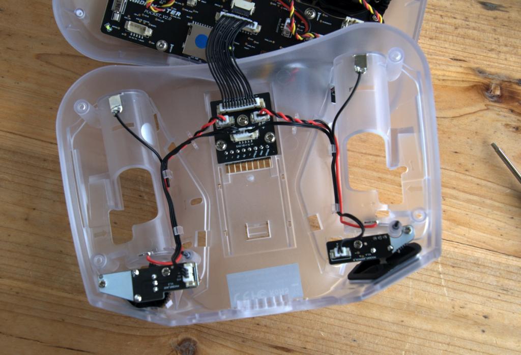 První obavou byly gimbaly. Dodávají se dva typy pružinek, od výrobce jsou tam silnější. Jistě je to na každém, co kdo preferuje, ale pro ty, co se často vyskytují s pákou na kraji pod 45 stupni určitě nebudou z těch silnějších nadšeni, takže jsem je vyměnil za ty slabší a ty utáhl, takže středy to chytá výborně, a na krajích se nepřetahuji s pružinou. Další obavou bylo rozlišení dané délkou pák. Samozřejmě lze používat ty původní, ale pokud jste uvyknutí na standardní velké gimbaly, původní páky neuspokojí, rozlišení není dostatečné. Proměřoval jsem oblouky konců pák na plnohodnotných gimbalech a je potřeba páky dodávané s Pocketem prodloužit o 6-7 mm. Po prodloužení pák a správném nastavení pružin nyní není k poznání rozdíl mezi chodem gimbalů na Pocketu a mém TX16s. Takže v tomto velké uspokojení.