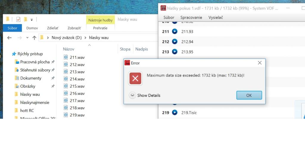 tak som to skúsil vkladať do vdf editora postupne no dostal som tam iba okolo 180 hlášok, prepisujem iba hovorené hlášky, nie zvuky /ako zvonenia, gongy a.p./ a dostanem sa na plnú pamäť -viď priložený skrín....ešte ma napadlo dávať tam mp3 a nie tie wav, ale to zase nabudúce....